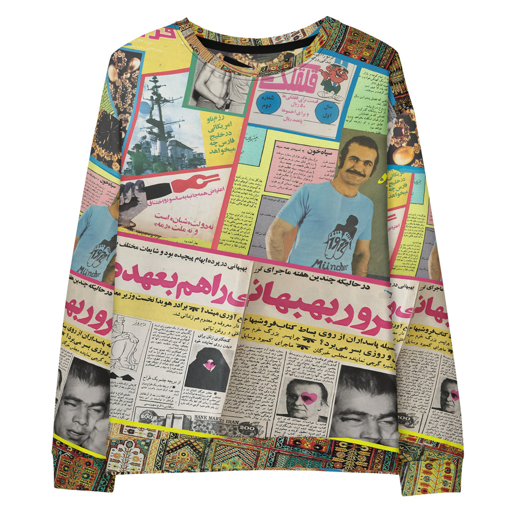 Inspired by the visuals and graphic design of 1970s Iranian newspapers, the Breaking News always speaks to the past with it's nostalgia. It feels more like colorful imagery that makes no sense. But the visual imagery tributes our ancestors gone including showman Fereydoun Farrokhzad and Champion wrestler GholamReza Takhti ,both icons that paved the way. Soft, stretchy, and made to last – this cotton sweatshirt and breathable fabric blends comfort and quality.