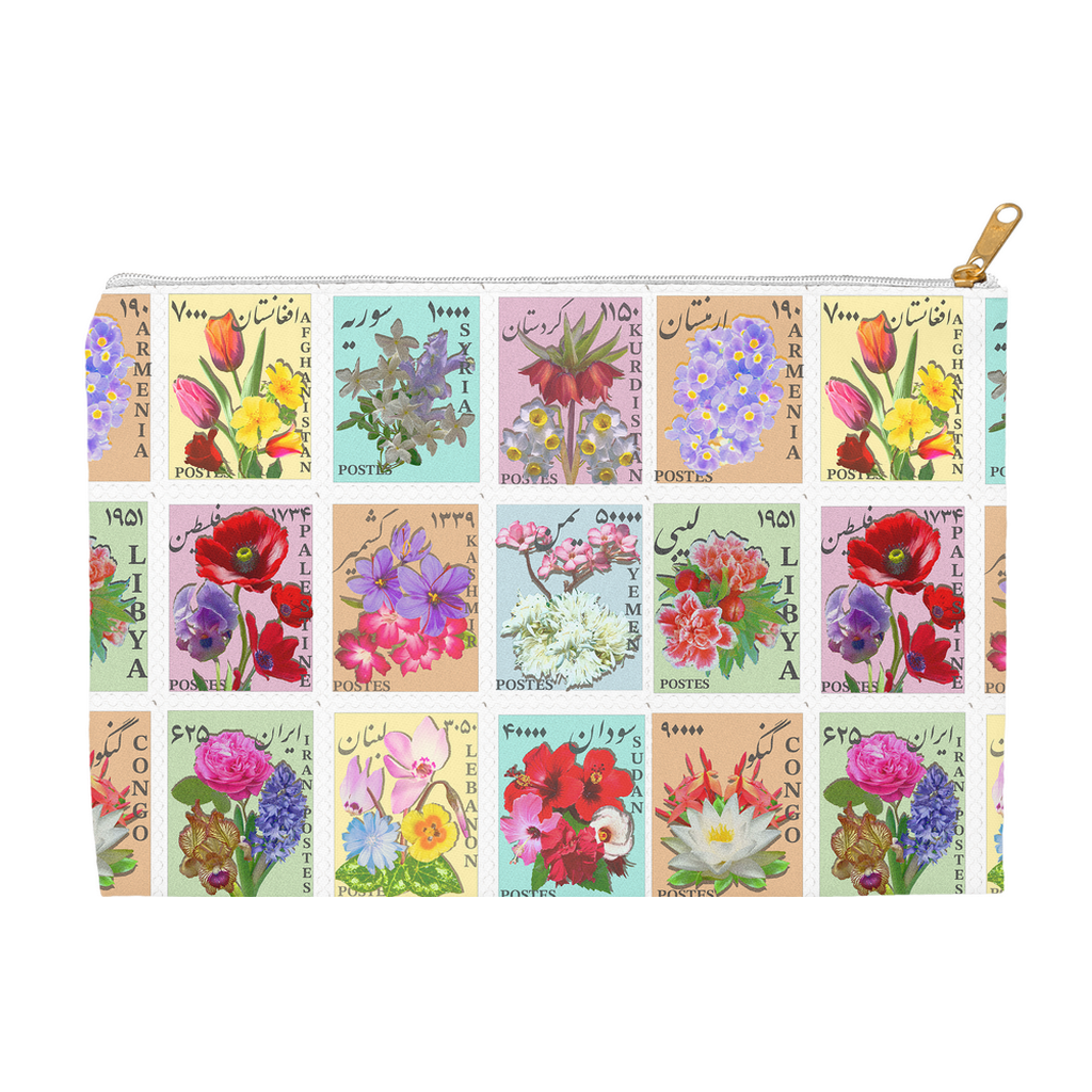 Tulips, poppies, jasmine, gul mohammadi rose, saffron , pomegranate blossoms, and other flora unite the region.Postage stamp inspired original artworks by Hushidar Mortezaie, send love to Palestine, Lebanon, Syria, Kurdistan, Kashmir, Afghanistan, Yemen, Congo, Sudan, Armenia, Libya, and Iran.